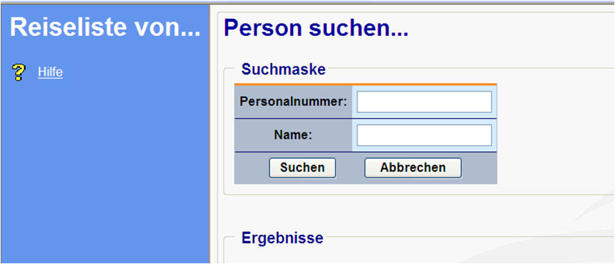 Mit dem Link Reiseliste von …auf der Navigationsleiste rufen Sie das Fenster Person suchen auf.